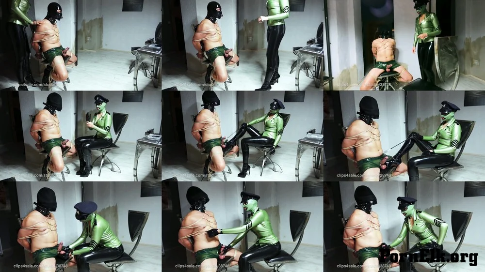 Video Description: Deep down in my girlfriend’s underground basement system my prisoner is waiting gagged and tied to a metal chair. He is wearing a pair of semi transparent green latex shorts and his cock and balls are all exposed. There is a rubber ring around his balls, his shaft and also his glans. He has been