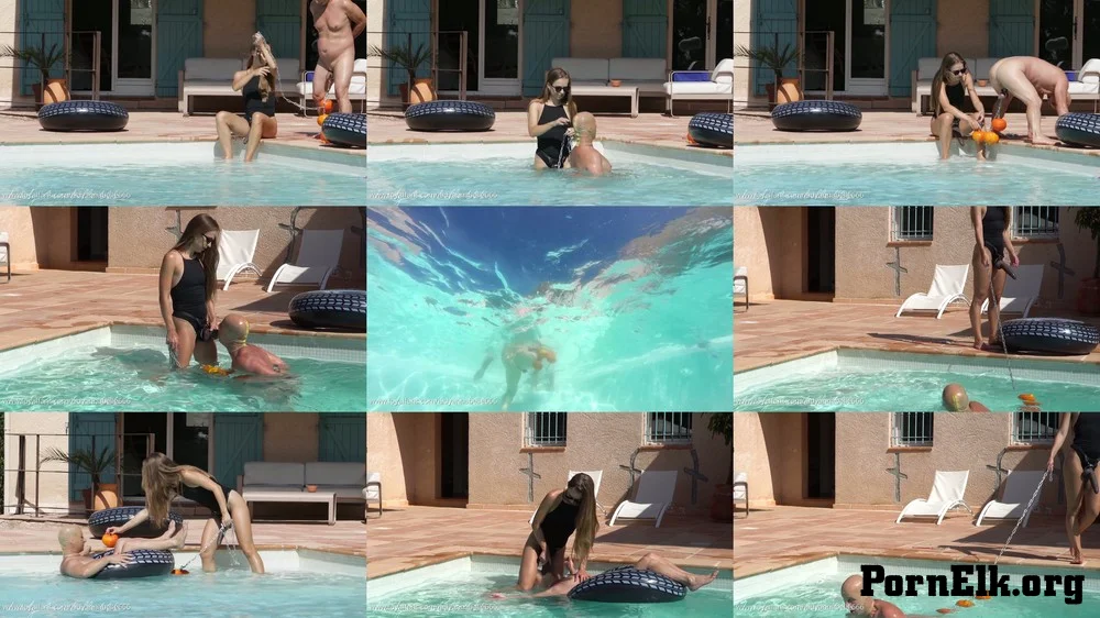 Video Description: Training my slave on the pool, with big chains on his testicles and some weights - pumpkins, he have to suck my cock deeper to dont forgot his destiny.