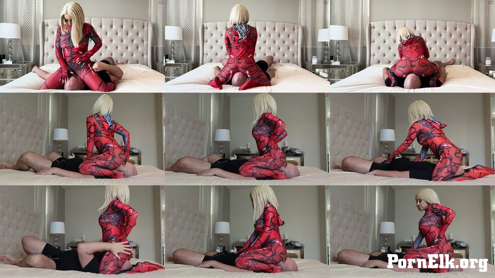Video Description: Nikki has been spying on her neighbor, noticing his fetish for face sitting. She dresses up in her Carnage outfit to break in his house. Tackling him on the bed and instructing him to be very quite. Smothering his face with reverse and front face sits. His hard on intrigues her, smothering his face